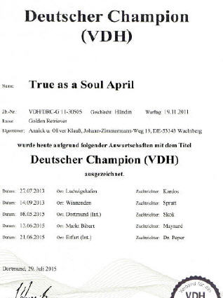 Nun ist es jetzt offiziell, unsere April ist jetzt VDH Champion, wir sind mächtig stolz und glücklich,